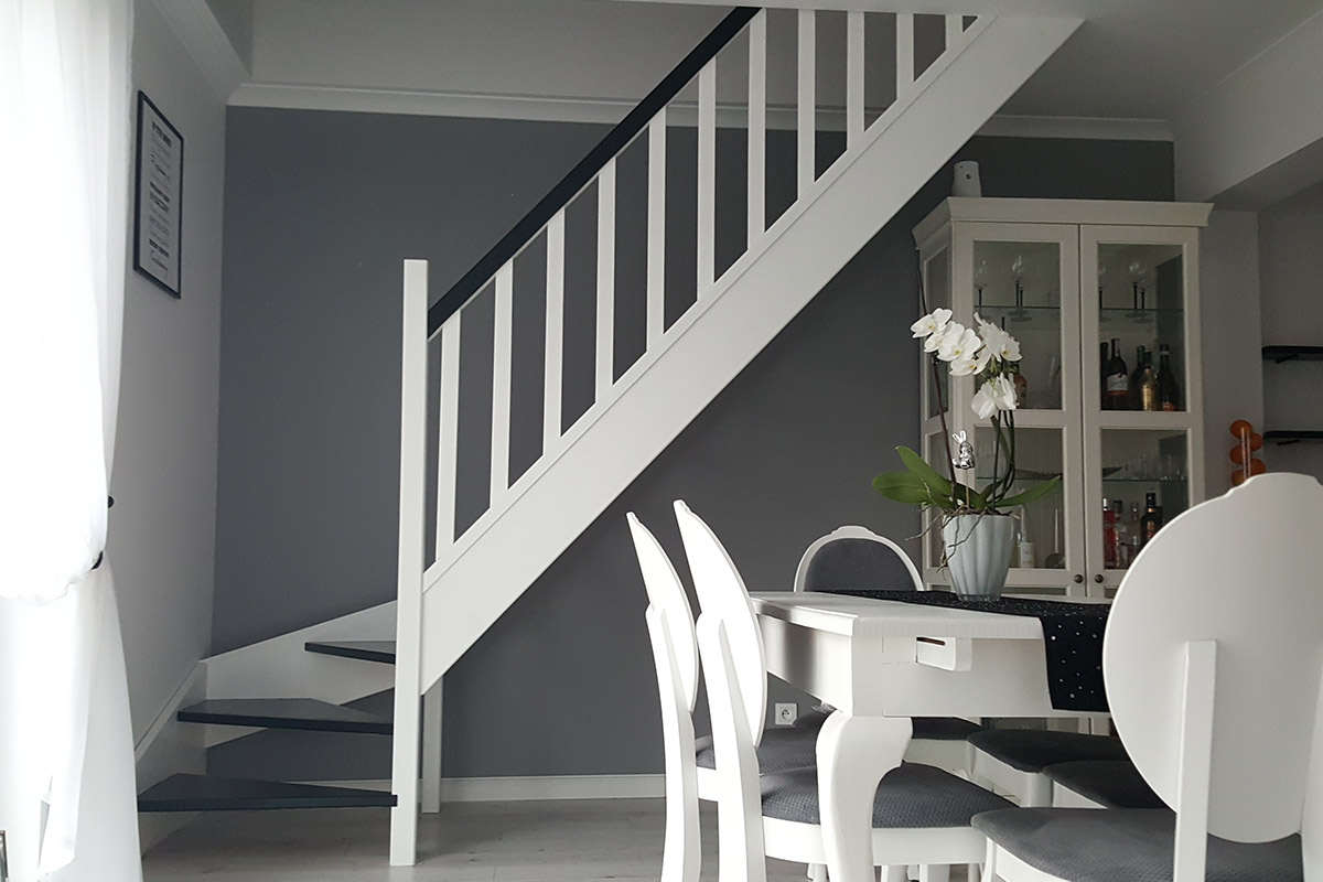 Schody Bystrý smrkové schody s dolním lomením dvoubarevné černá a bílá realizace zdola