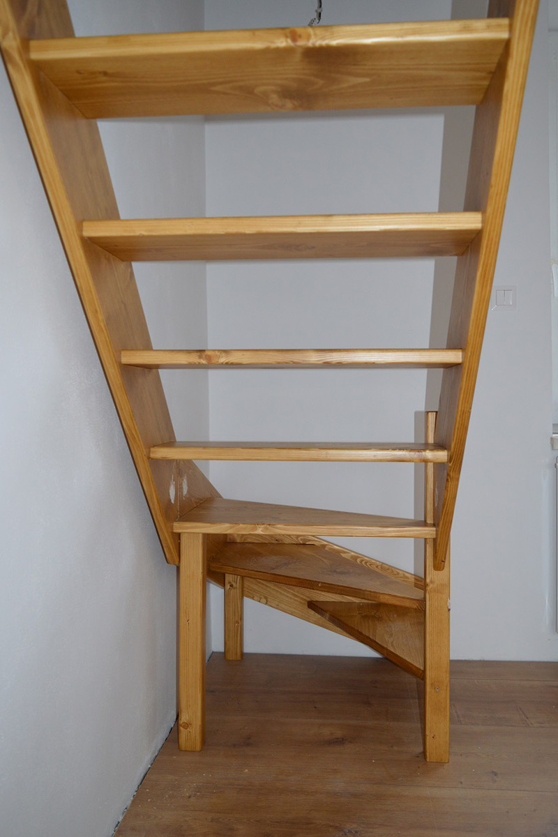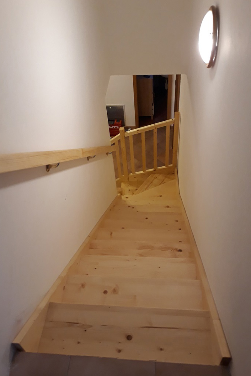 Schody Bystrý smrkové schody s dolním lomením krátké a úzké bezbarvý lak realizace zdola