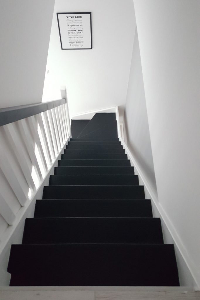 Schody Bystrý smrkové schody s dolním lomením dvoubarevné černá a bílá realizace shora